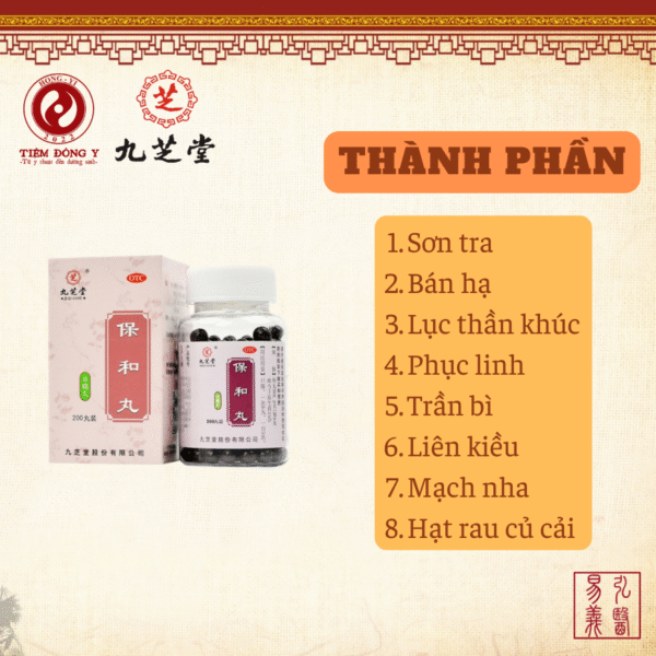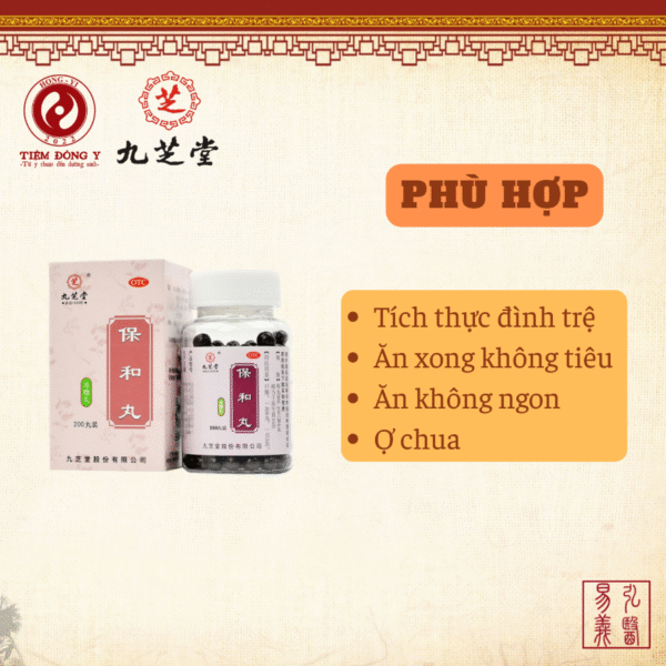 Bảo hòa hoàn (保和丸) là cổ phương tiêu thực hòa vị, lý khí hóa tích, chủ trị thực tích do ẩm thực đình trệ. Xuất xứ: Dan Khê Tâm Pháp (丹溪心法) của Chu Chấn Hanh (朱震亨) đời Nguyên. Dấu hiệu: đầy tức vùng vị quản, ợ chua hôi, ăn kém, bụng trướng, đại tiện thất thường, rêu lưỡi dày nhớt. Thành phần kinh điển: Sơn tra, Mạch nha, Thần khúc, Bán hạ, Trần bì, Phục linh, Lai phục tử, Liên kiều. Phù hợp người ăn uống thất thường, nhiều dầu mỡ, tiêu hóa chậm hấp thu.