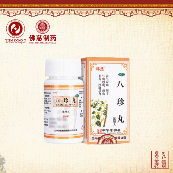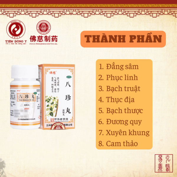 Bát trân hoàn (八珍丸) xuất xứ 《Thụy trúc đường kinh nghiệm phương 瑞竹堂經驗方》. Phối hợp Tứ quân tử thang và Tứ vật thang, chủ trị khí huyết hư. Công năng: ích khí bổ huyết, kiện tỳ. Chỉ định: sắc mặt nhợt, mệt mỏi, chóng mặt, hồi hộp, ăn kém, kinh ít. Thành phần: Nhân sâm, Bạch truật, Phục linh, Cam thảo, Thục địa, Đương quy, Bạch thược, Xuyên khung; gia thêm Sinh khương, Đại táo.