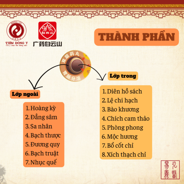 – Lớp trong (diên hồ sách, lệ chi hạch, bào khương, chích cam thảo, phòng phong, mộc hương, bổ cốt chỉ, xích thạch chỉ).