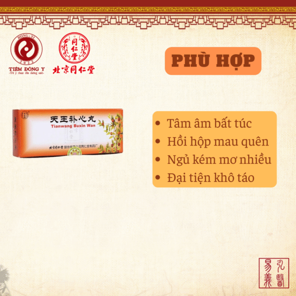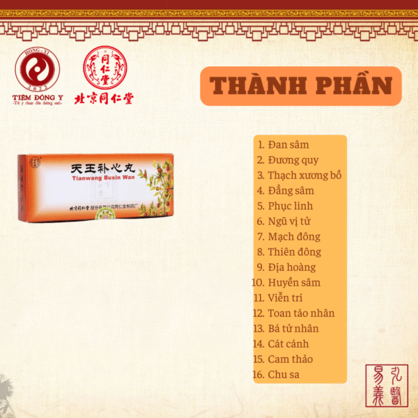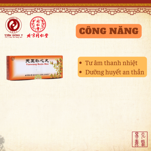 **Thiên vương bổ tâm hoàn** (天王补心丸) xuất xứ từ sách *Y học tâm ngộ* (《医学心悟》) của Hứa Trực (许浚). Bài thuốc phối hợp nhiều vị quý như nhân sâm, sinh địa, đan sâm… Công dụng chính là tư âm dưỡng huyết, an thần định chí, ích khí sinh tân dịch. Thường dùng cho người tâm thận bất giao, âm huyết hư tổn, biểu hiện mất ngủ, hay quên, hồi hộp, phiền táo, tinh thần suy nhược.